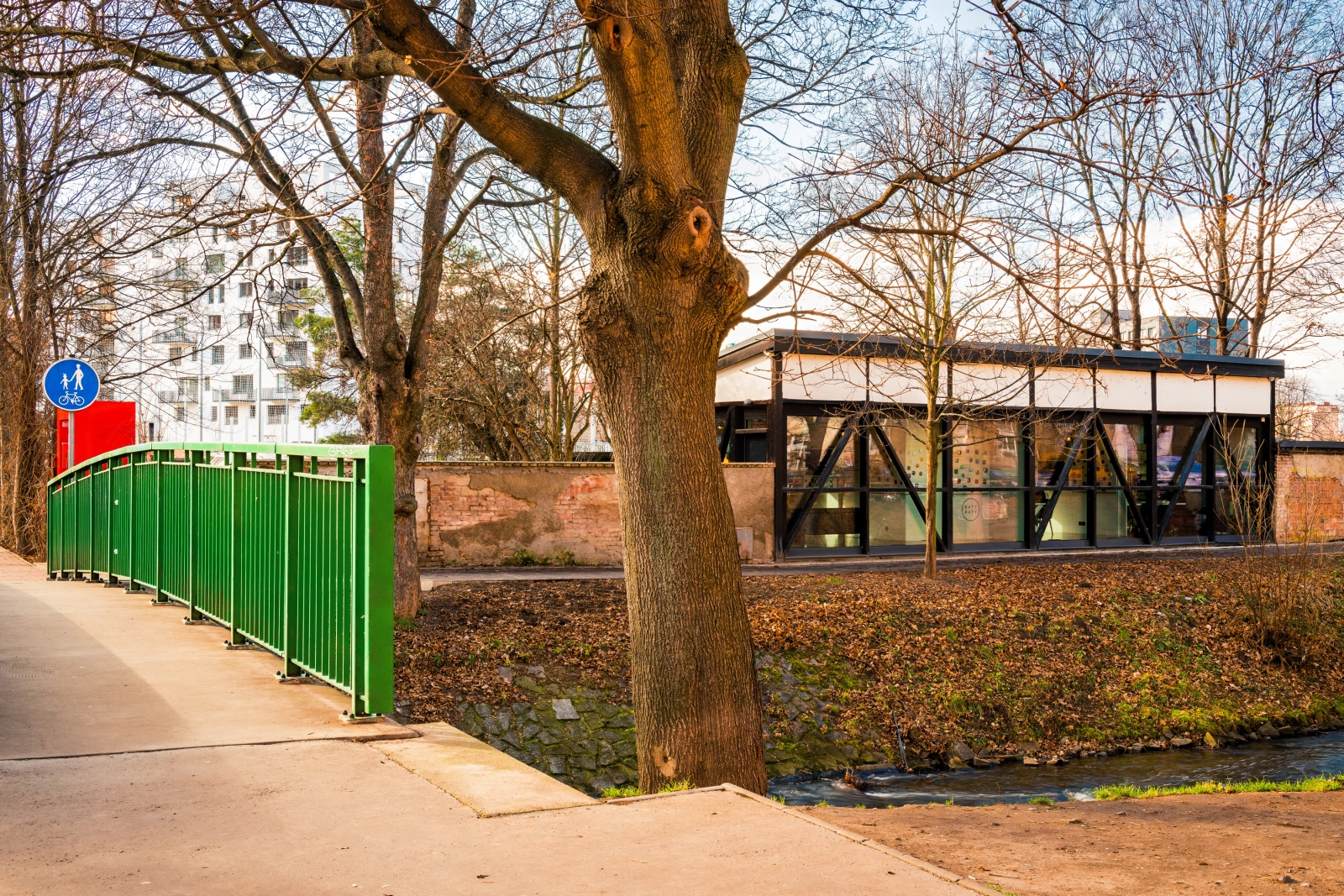 (přes betonový mostek z křižovatky ulic Piskáčkových, Na břehu a Mlékárenská, výrazný červený portál)
